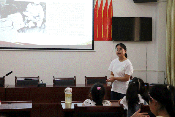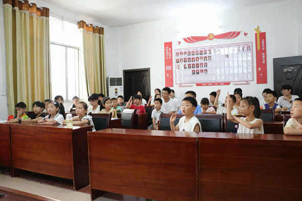 “举小手,守信念,红色火苗闪亮亮”,学堂里面志愿者带领小朋友们齐声朗读原创革命口号。开班第一课,志愿者结合以“七七事变”为历史背景切入点,引导孩子们树立“铭记历史、珍惜和平”的认知。志愿者通过PPT展示、互动问答等形式,生动解析大别山横跨湖北、安徽、河南三省的地理特征、战略地位及革命历史。在“知识快问快答”环节,小朋友们踊跃抢答“大别山跨越三省”“革命之花是映山红”等问题,现场气氛热烈,展现出对红色历史的浓厚兴趣。