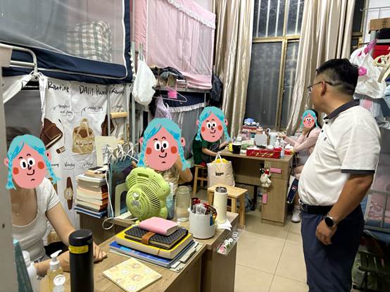 走访期间,孙勇与同学们进行了亲切交谈,细致询问了同学们暑期社会实践、在家学习生活及返校途中的情况,并对大家顺利返校表示欢迎。他叮嘱同学们要快速调整作息规律,积极适应新学期的学习节奏,同时重点强调了宿舍安全的重要性,特别是用电安全、消防安全和防盗防骗意识,要求大家严格遵守公司公寓管理规定,共同维护安全稳定的校园环境。