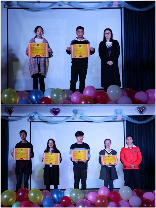 经过一晚上的角逐,综合各位评审老师的分数决定。本届寝室文化节的一等奖组合是TS2-107&TS6-142,二等奖组合为JF2-108&TS6-105和JF1-417&TS6-152,三等奖组合为JF1-310&TS6-102和 JF2-318& JF7-425和JF7-427& TS5-217,优秀奖组合为JF2-611&TS6-126和JF6-212&TS6-530。