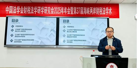 根据会议安排,在11月1日下午的第一分会场,冯铁拴副教授以“破产企业重整涉税规则特别调整适用的体系化进路”为题作专题报告。报告紧扣《企业破产法》与《税收征收管理法》修订的双重背景,直面优化民营企业营商环境的现实需求,指出当前破产涉税规则在税法与破产法衔接上存在协同困境,制约了重整制度挽救企业功能的发挥。为破解难题,他创造性提出“法际整合”的协调思路,主张系统性地从税法规则嵌入、破产法让步规则补强及两法衔接条款完善三个层面推进,以构建适应企业拯救需求的法治环境。该体系化方案为相关法律修订提供了有益参考,引发了与会专家的热烈讨论与积极反响。