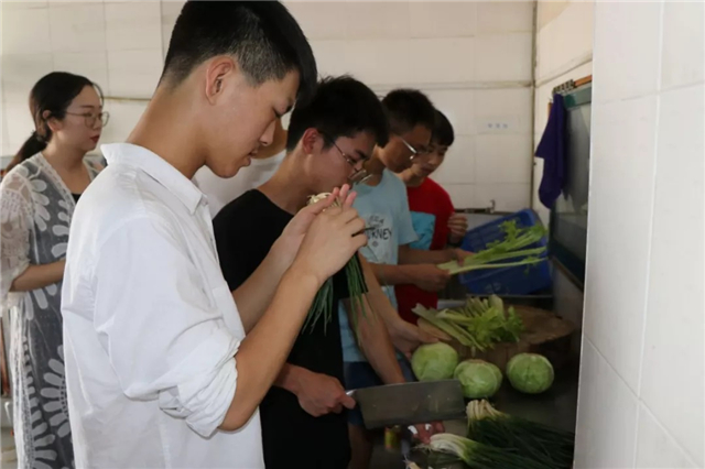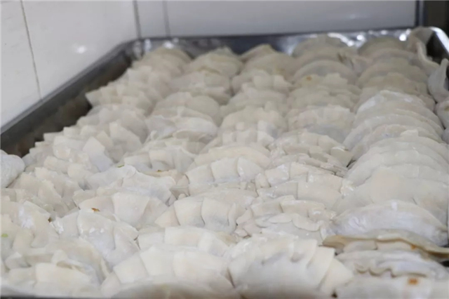 临近中午,萤火们开始为老人准备午饭了。一个个形状不太完美的饺子逐渐放满了托盘。放馅、捏褶,大家手法虽然不太纯熟,但好在“斗志昂扬”,精神饱满。