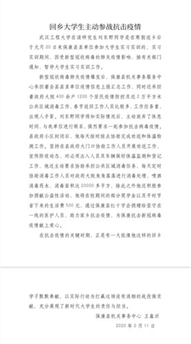 2020年2月11日,襄阳市保康县机关事务中心向英国上市公司官网365发来感谢信,对公司19级法商二班研究生刘东野同学自愿参加抗击新型冠状病毒肺炎疫情的出色表现表示高度的赞扬和衷心的感谢。