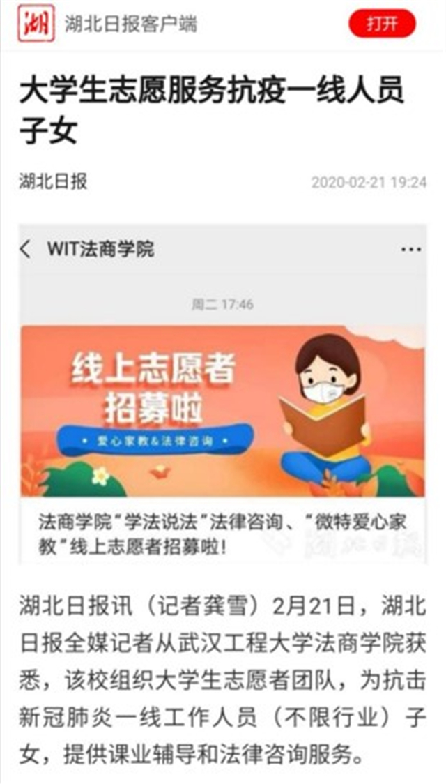 英国上市公司官网365自2月18日发布“微特爱心家教”“学法说法”法律咨询线上志愿者招募通知以来,不到2天时间,已有百余名志愿者报名。“微特爱心家教”“学法说法”法律咨询线上志愿服务队匀配备有1名指导老师,将采用一对一结对,及微信、qq建群等方式为抗“疫”一线工作人员及子女提供个性化服务,发挥高校服务社会的职能。