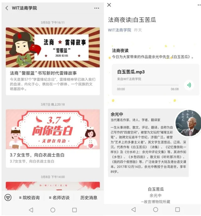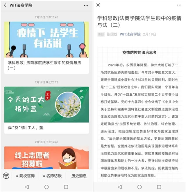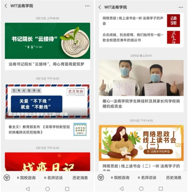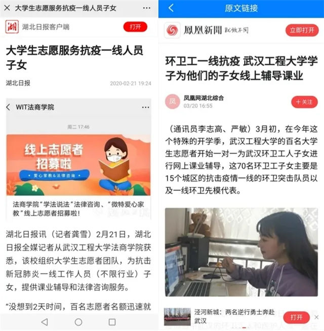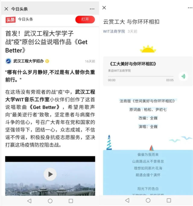 我们用爱心战“疫”。公司19级经贸2班屈晨昊同学及其团队创作的原创公益说唱作品被今日头条、长江云等多家媒体报道转载。员工全巍改编的歌曲《工大美好与你环环相扣》在云端掀起热潮。公司研究生特警王程书写新时代雷锋故事,为救助患者家属,每天和衣而眠。公司开设“法商夜读”,邀你做主播,与法商学子共成长。