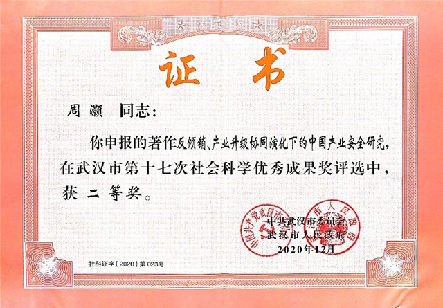 武汉市委办公厅、市政府办公厅发布了《关于武汉市第十七次社会科学优秀成果的通报》(武办文[2020]60号),公布了本界获奖名单。2021年4月16日武汉市社会科学联合会在武汉会议中心举行了获奖成果颁奖表彰大会,周灏教授受邀作为获奖代表上台领奖。本次获奖成果是周灏教授主持并完成的国家社会科学基金重点项目的研究成果,这说明获奖者在贸易摩擦和产业安全方面的研究得到了学术界和社会的广泛认同。