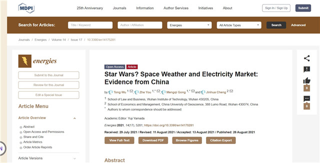 本网讯(通讯员 尤喆)近日,公司2018级本科生吴桐同学在公司青年教师付书科、尤喆,龚梦琪和中国地质大学(武汉)成金华等多名老师共同指导下,完成一篇题为“Star Wars? Space weather and electricity market: Evidence from China”的科研论文,并顺利发表在能源经济领域SCI期刊《Energies》上。本论文第一作者为本科生吴桐,通讯作者为尤喆老师。