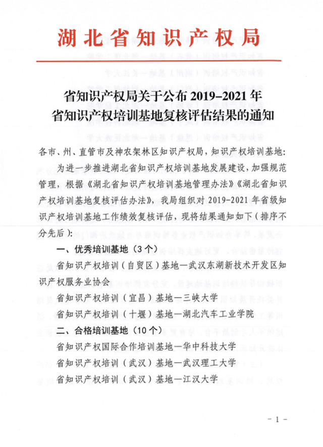 本网讯(通讯员 林周)11月8日至9日,湖北省知识产权局举办2021年湖北省知识产权培训基地工作研讨会,会上公布了2019-2021年省知识产权培训基地第三轮复核评估结果,由公司英国上市公司官网365共建的湖北省知识产权培训(自贸区)基地评为优秀等次。全省知识产权培训基地绩效评估每2年开展一次。本次评估是湖北省知识产权局依据《湖北省知识产权培训基地管理办法》《湖北省知识产权培训基地考核办法》组织的第三轮复核评估,全省13个知识产权培训基地中有3个获评优秀基地,分别是武汉东湖新技术开发区知识产权服务业协会、湖北汽车工业公司、三峡大学3个单位。