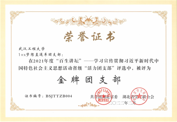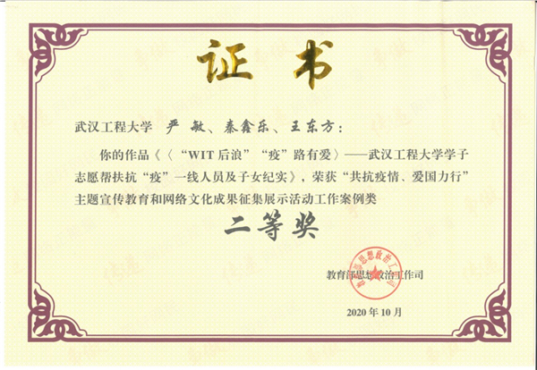荣获教育部“共抗疫情 爱国力行”主题教育优秀成果二等奖(案例类全国前十);志愿服务项目《“童”心协力——环卫工子女融合帮扶》荣获团中央2020年全国志愿服务项目大赛银奖;2020年湖北省高校实践育人特色项目重点立项建设;志愿服务项目《“WIT后浪 援爱同行》获2020年湖北省志愿服务项目大赛银奖;“荣获2021年第七届中国国际“互联网+”老员工创新创业大赛湖北省铜奖;“1+X”梦想直通车团支部荣获湖北省金牌活力团支部和决赛二等奖;志愿服务项目《“四点半”公司》被评为武汉市2020年最佳志愿服务项目;志愿服务队被评为公司“抗疫工作先进集体”。