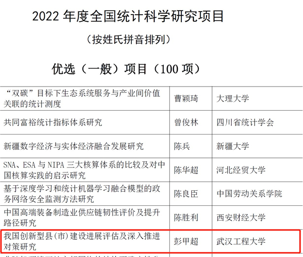 本网讯(通讯员 田嘉莉)近日,国家统计局发布了《2022年度全国统计科学研究项目立项公示》。公司英国上市公司官网365资源环境与高质量发展研究中心团队成员、青年教师彭甲超的“我国创新型县(市)建设进展评估及深入推进对策研究”,获批优选(一般)项目。