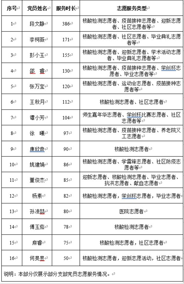员工第五党支部积极引导支部党员发挥先锋模范作用,在志愿服务中践行为人民服务的宗旨。自2020年9月入学以来,员工第五党支部全体党员积极参加公司核酸检测、社区防疫、疫苗接种、迎新等校内外志愿服务活动,志愿服务累计时长达支2168.2小时。他们用实际行动诠释了共产党员艰苦奋斗、无私奉献的责任担当。