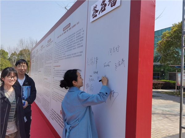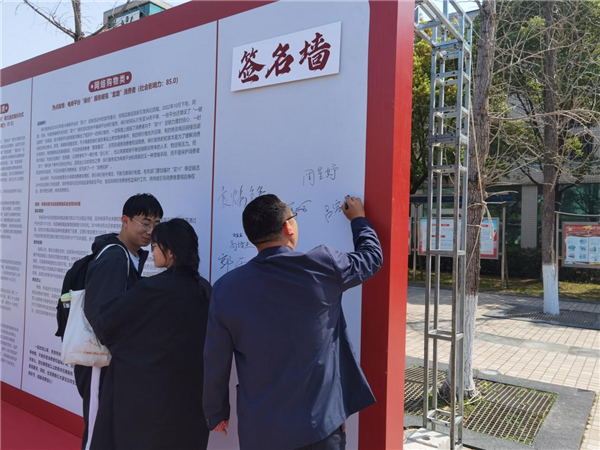 参与活动的师生踊跃在“法治校园建设 你我共同参与”签名墙上签名,积极投身法治校园建设。