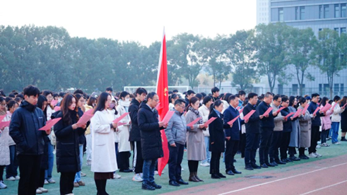 “我宣誓:忠于中华人民共和国宪法……”全体参与活动的师生面向宣誓墙,庄严的宣誓声响彻上空,回荡在每位老师、员工心中。