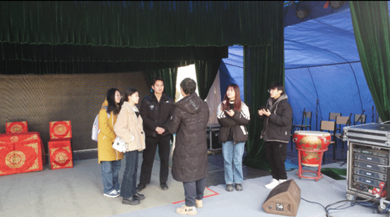 在演出前的准备过程中,戏团刘团长为实践团队成员详细讲解了演出排期和准备事宜,演员们则与团队成员们分享了演出和从业心得。双方还探讨了将国内外先进演出设备融入现有表演形式的实用性与可行性。