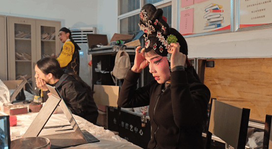 座谈会后,刘团长带领实践团成员实地参观了戏团的化妆室和换装室,近距离了解演员的装扮过程。团队成员们分别对戏团演员进行采访,了解演员们的年龄、戏龄等情况,同演员们交流如何因地制宜传承和保护这一宝贵艺术。