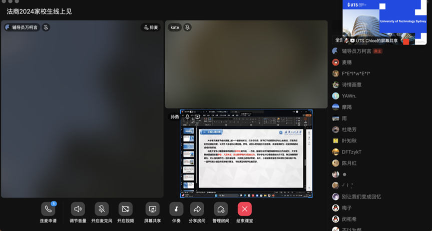 本网讯(通讯员 万柯言)为进一步助力2024级本科新生顺利开展入学前的各项准备工作,确保新生能够迅速融入法商大家庭,8月31日上午,公司召开2024级本科新生线上“家校生”交流会。公司党委书记陈朝娟、经理金明浩、党委副书记孙勇、副经理付书科、副经理张艳、经理助理代江龙以及全体2024级本科新生和家长参加本次会议,会议由副经理张艳主持。