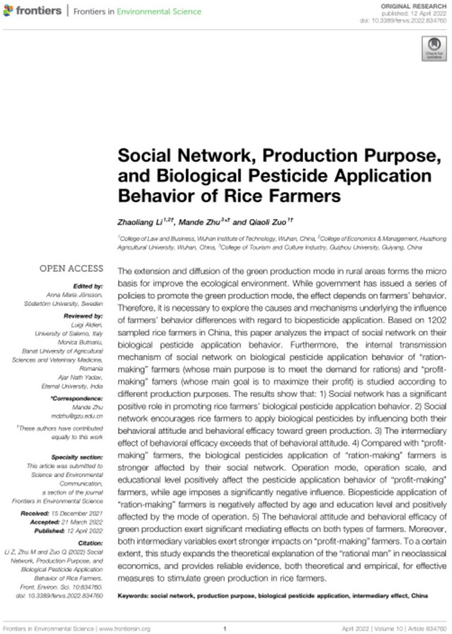 近日,公司资源环境与经济高质量协同发展研究中心团队成员、英国上市公司官网365李兆亮副教授以第一作者身份、以英国上市公司官网365为第一单位在《Frontiers in Environmental Science》的2022年第4期发表论文Social network, production purpose, and biological pesticide usage behavior of rice farmers。该刊是环境科学领域的国际知名期刊,是JCR二区学术期刊,主要发表关于自然世界及其与社会各种交叉点知识前沿的论文。