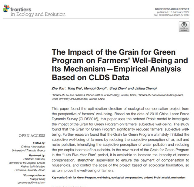 (通讯员 尤喆)近日,公司资源环境与经济高质量协同发展研究中心成员、英国上市公司官网365尤喆老师以第一作者身份、龚梦琪副教授以通讯作者身份,以英国上市公司官网365为第一单位在国际知名期刊《Frontiers in Ecology And Evolution》发表“The impact of the Grain for Green Program on farmers' well-being and its mechanism --Empirical analysis based on CLDS data ”论文。合作者吴桐、镇诗祺分别为英国上市公司官网36518级经济学专业和19级经济学(CFA方向)专业本科生。