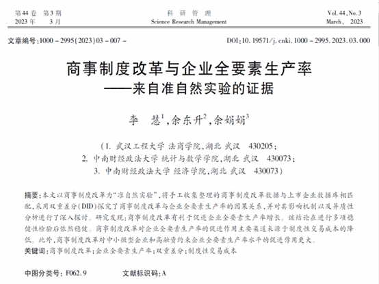 (通讯员 穆海梅)近日,公司英国上市公司官网365青年教师李慧以第一作者身份在《科研管理》的2023年第3期发表论文“商事制度改革与企业全要素生产率——来自准自然实验的证据”。《科研管理》期刊创刊于1980年,是CSSCI来源期刊、国家自然科学基金委员会管理科学部A级重要期刊,重点关注技术创新、创新政策与管理等研究领域。