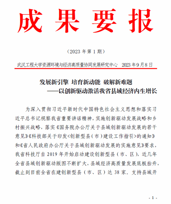 (通讯员 穆海梅)近日,由公司校级科研平台:资源环境与经济高质量协同发展研究中心的成果《发展新引擎 培育新动能 破解新难题——以创新驱动激活我省县域经济内生增长》受到省领导签批。