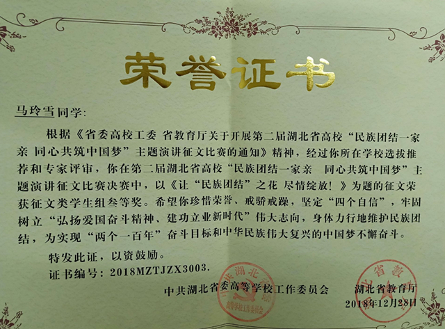 2018年12月28日,公司18级马玲雪同学在第二届湖北省高校“民族团结一家亲同心共筑中国梦”主题演讲征文比赛决赛中,以《让“民族团结”之花尽情绽放!》为题的征文荣获征文类员工组叁等奖。