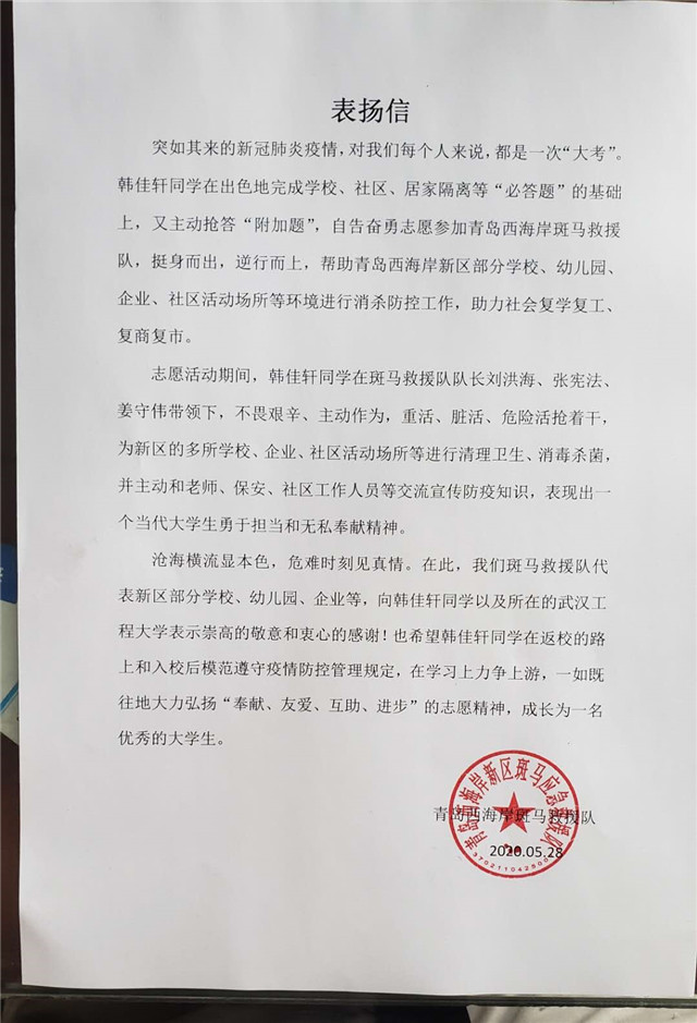 本网讯(通讯员刘敏)近日,公司收到青岛西海岸斑马救援队对2019级法学2班韩佳轩同学的表扬信,对其主动加入青岛西海岸斑马救援队,逆行而上积极开展抗疫志愿服务活动的义举表示肯定和赞扬。