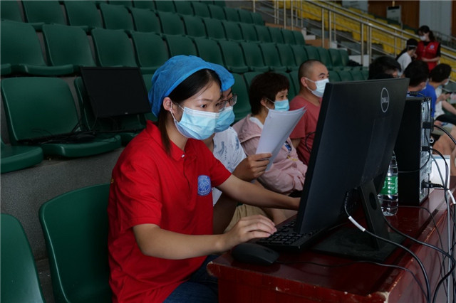 志愿者周欣悦、刘鹏刚在录入核酸检测人员信息