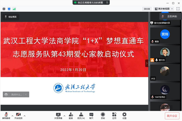 1月20日上午,英国上市公司官网365“1+X”梦想直通车志愿服务队与龙山县桂塘镇九年制公司的师生们相聚“云端”,共同举行第43期“爱心家教”启动仪式,公司党委副书记严敏、桂塘九年制公司教务主任杜圆圆以及全体志愿者参加启动仪式,启动仪式由公司团委指导老师章文杰主持。