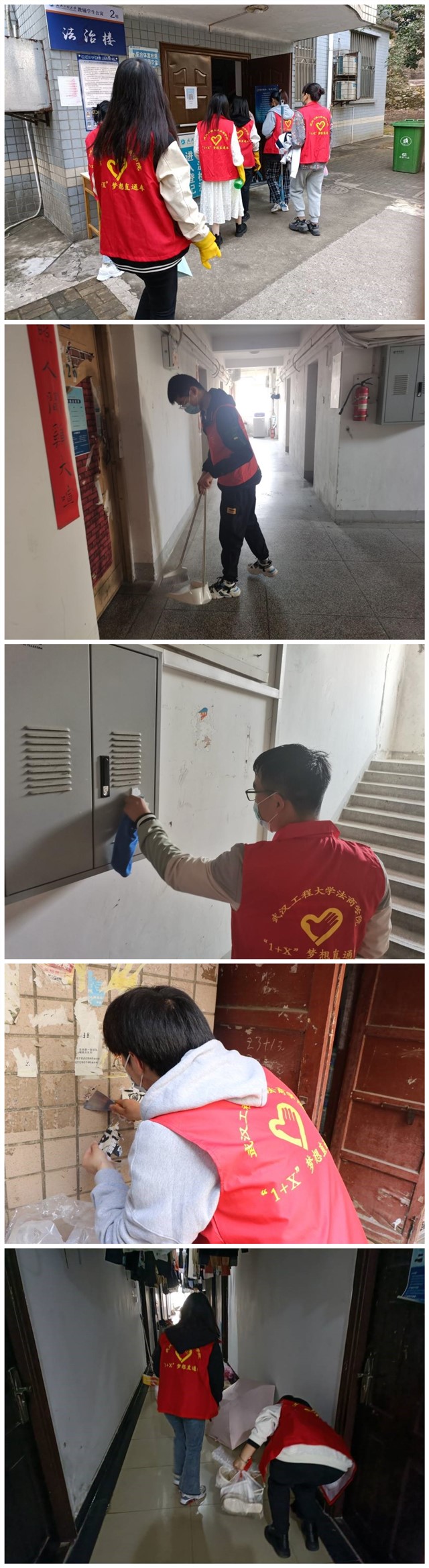 “1+X”梦想直通车志愿服务队前往教辅、泰塑员工公寓打扫宿舍楼道、清理垃圾。志愿者们按照事先的统一安排,各司其职,以行动为表率,不怕脏、不怕累、不偷懒,井然有序的开展打扫活动,确保不留死角,不留盲区。