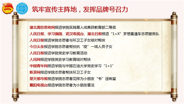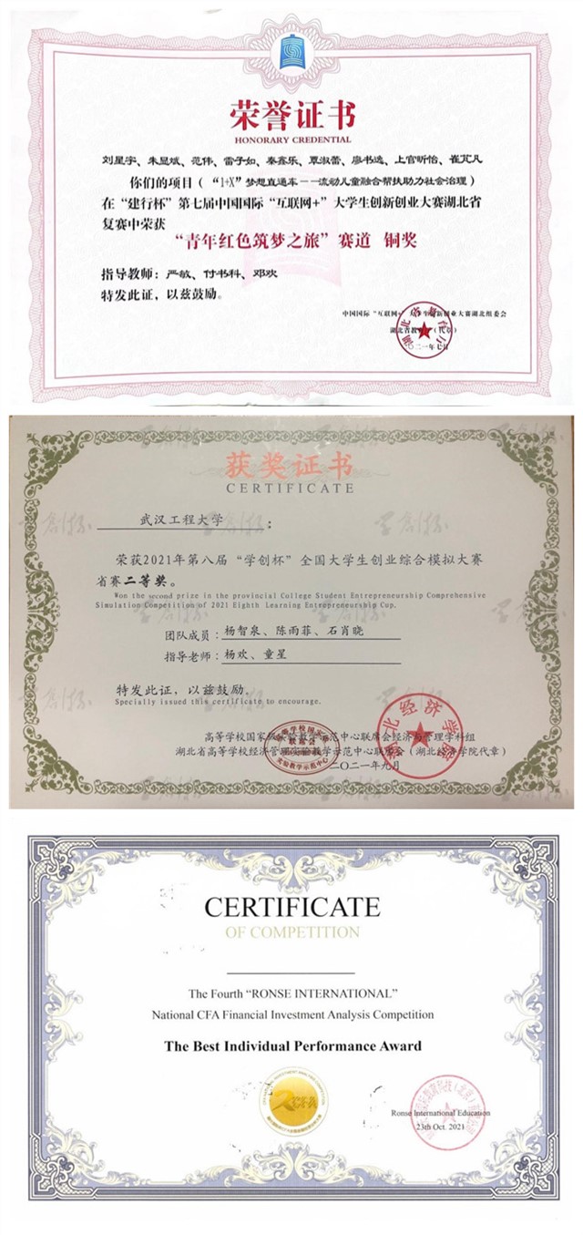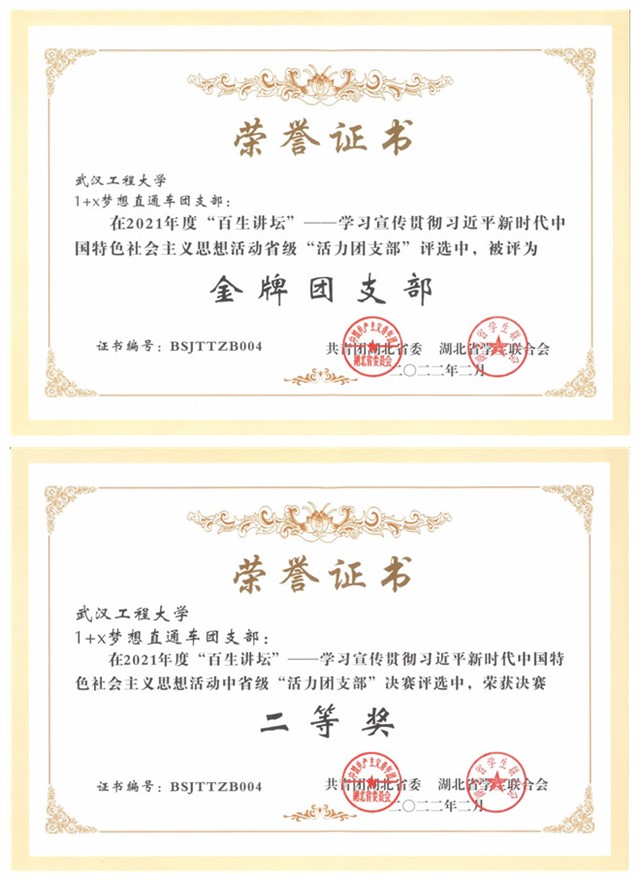 团学活动优秀案例荣获教育部“共抗疫情、爱国力行”主题宣传教育和网络文化成果二等奖(案例类全国前十)、志愿服务项目分别荣获团中央全国志愿服务项目大赛银奖、湖北省银奖和武汉市最佳志愿服务项目。打造的志愿服务品牌“1+X”梦想直通车被湖北省教育厅重点立项建设,其团支部被评为湖北省金牌活力团支部,荣获中国国际互联网+大赛湖北省铜奖。近三年团学活动被人民日报、学习强国、湖北日报等主流媒体报道40余次。