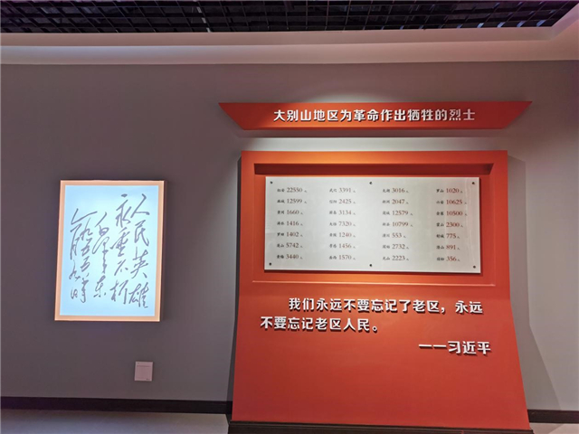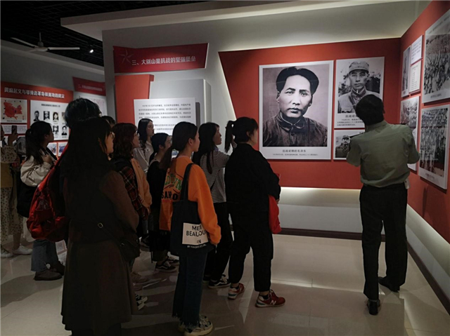 大别山是红色资源富集区,是建党的重要策源地,人民军队的重要诞生地,是治党、治国、治军杰出人才的摇篮。在革命战争年代,大别山英雄儿女前赴后继,战斗不息,有200余万人参战,100万人英勇牺牲,英雄的鲜血染红了大别山。英山四季花海深入挖掘、整理大别山和英山红色文化资源,建设了大别山革命历史文化陈列馆,展厅面积1200平方米,分“辉煌大别山”、“英雄大别山”、“红色英山”三大展区,综合运用版面说明、实物展示、视频播放、场景还原等多种形式,集中展现了1927年至1949年大别山和英山发展党组织、开辟根据地、组织三二暴动、组建红军、北上长征等历史事件。经过讲解员的细心讲解,大家对大别山人民的革命斗争史有了进一步的认识和理解,同学们的思想得到了一次深刻的洗礼。