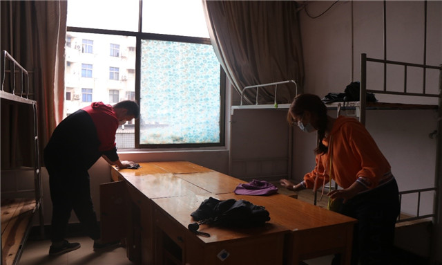 新生报到前,公司领导班子和党员志愿者在新生宿舍进行大扫除。
