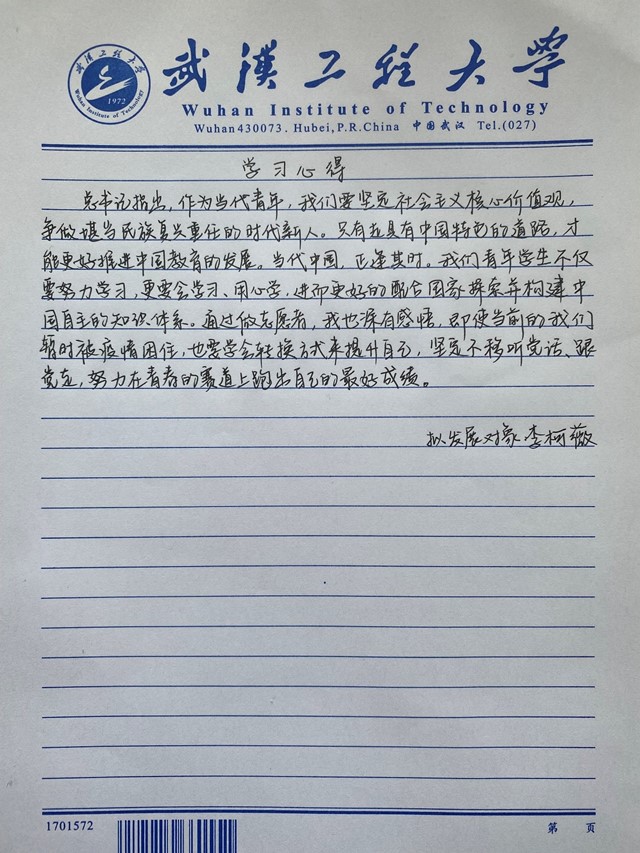 五四青年节将近,习近平总书记在考察人民大学时对青年的问候和嘱托,令我倍受鼓舞。我看到了总书记对青年一代的高度重视和热切期望,我会牢记习近平总书记的教诲,听党话,跟党走,继承优良传统,赓续红色血脉。努力学习科学文化知识,脚踏实地打好根基,用汗水书写青春华章,成长为堪当民族复兴重任的时代新人,在未来能够积极投身于社会发展与国家建设的重要事业中。