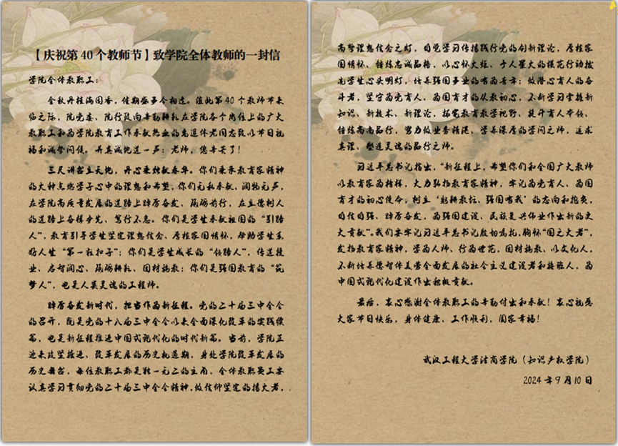 公司以致全体教职工一封信的形式为全院教师送去节日的祝福,并号召大家要认真学习贯彻党的二十届三中全会精神,做信仰坚定的播火者,高擎理想信念之灯,自觉学习传播践行党的创新理论,厚植家国情怀、锤炼忠诚品格,以心怀火炬、予人星火的模范行动拨亮员工心头明灯,培养强国事业的有为青年;做潜心育人的奋斗者,坚守为党育人、为国育才的从教初心,不断学习掌握新知识、新技术、新理论,拓宽公司产品视野、提升育人本领、锤炼高尚品行,努力做业务精湛、学养深厚的学问之师,追求真理、塑造灵魂的品行之师。